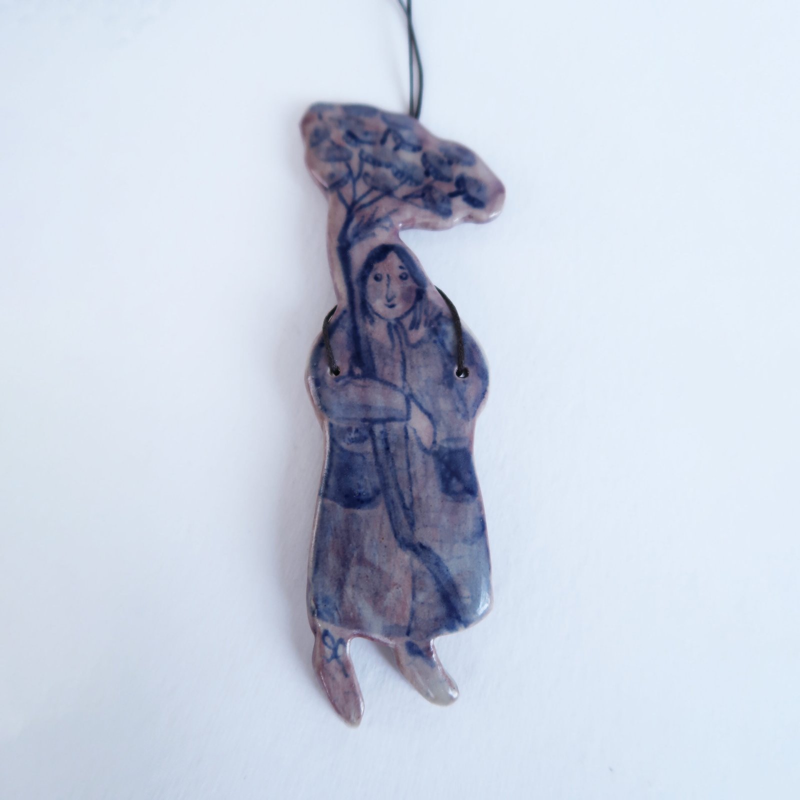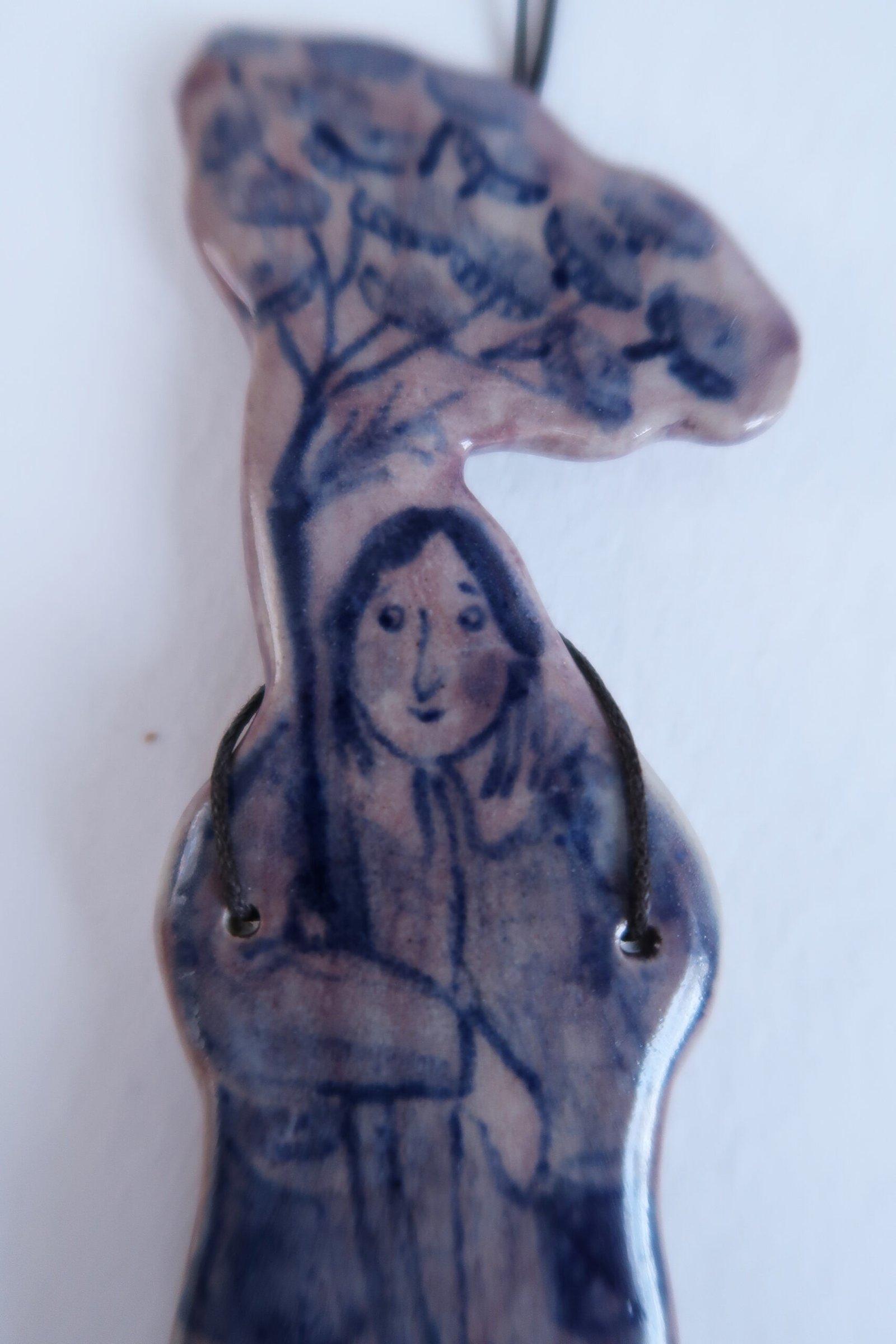 This is a large one of a kind pendant. Purple engobe, cobalt blue underglaze painting. Comes with an adjustable waxed cotton cord.
